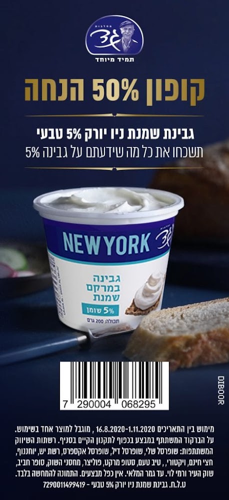 קבלו קופון 50% הנחה על גבינת שמנת ניו יורק 5% טבעי של גד.מוגבל למוצר אחד בשימוש. בכפוף לתקנון בסניף.