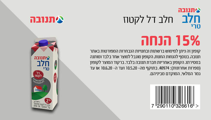 קבלו קופון 15% הנחה לחלב דל לקטוז באריזה של ליטר מבית תנובה.