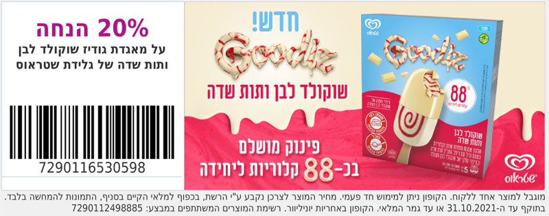 קבלו קופון 20% הנחה על מאגדת גודיז שוקולד לבן ותות שדה של גלידת שטראוס.הקופון תקף באונליין ברשתות רמי לוי ושופרסל וכן בחנויות הפיזיות של הרשתות ויקטורי, רמי לוי, ח.כהן, טיב טעם, יוחננוף, מחסני השוק ושופרסל