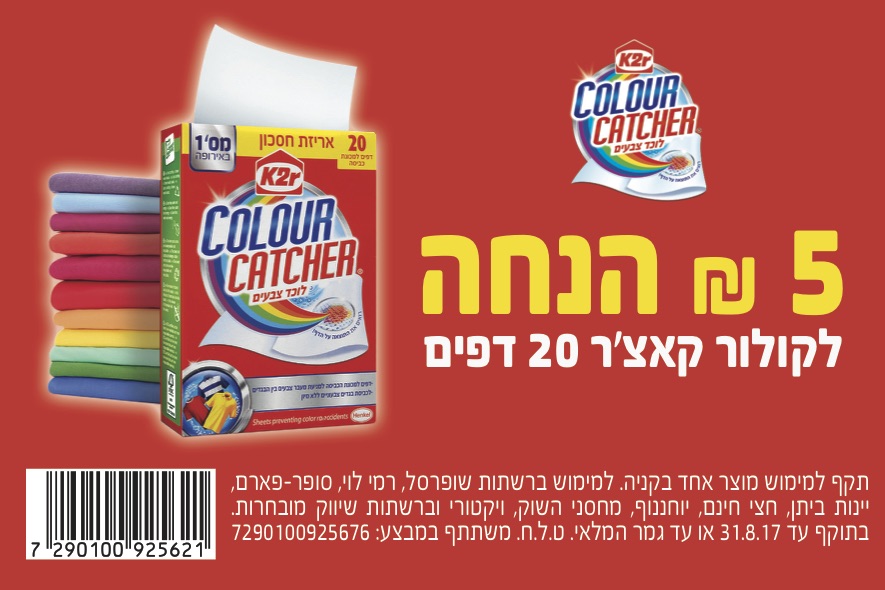 קבלו קופון 5 ש"ח הנחה לקולור קאצ'ר- 20 דפים למכונת כביסה.